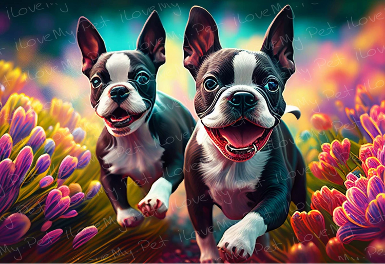 The design is a mesmerizing blend of the dog's iconic features set against a riot of colors, creating a psychedelic and dreamlike ambiance. Each Boston Terrier is framed by a fantastical floral backdrop, adding a kaleidoscopic array of hues that enhance the whimsical and enchanting feel of the artwork.