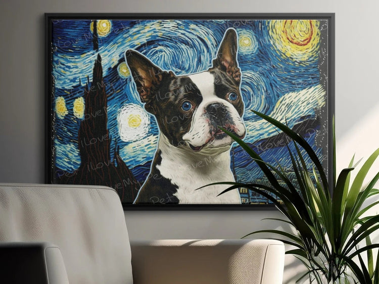 Embodying the spirit of the Boston Terrier, this captivating artwork features the intelligent and friendly face of the breed, set against a backdrop inspired by the illustrious Van Gogh's "Starry Night".