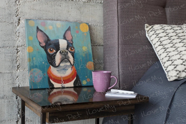 The artwork beautifully portrays the dog's black and white coat, perked ears, and soulful eyes, embodying the playful curiosity that defines the breed. Surrounded by colorful, floating bubbles, the painting creates a playful and imaginative atmosphere, perfect for any Boston Terrier lover's home.