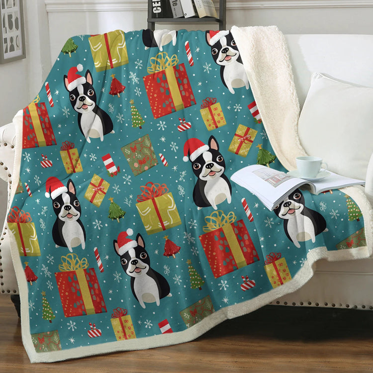 Crafted with a festive pattern that's an ode to the Boston Terrier, this blanket captures the breed's characteristic charm with a splash of holiday spirit. Adorned with jovial canines wearing Santa hats and surrounded by colorful gift boxes, trees, and candy canes, the design is set against a cheerful teal background that accentuates the reds, greens, and golds. The cartoonish art style is both playful and endearing, making it a perfect fit for those who adore Boston Terriers and the Christmas season alike.
