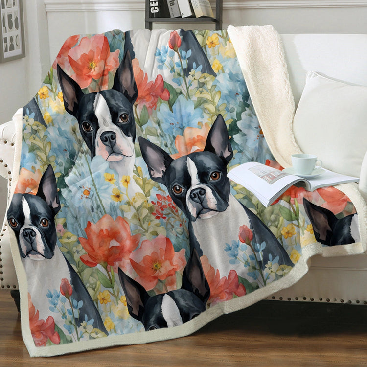 Designed with both Boston Terriers and people in mind, this luxurious blanket combines comfort with captivating design. It features a group of intricately painted Boston Terriers set against a backdrop of vibrant, watercolor-rendered blue flowers. The scene captures the charming and friendly demeanor of Boston Terriers, matched by the joyful colors of red tulips, serene lotus flowers, and cheerful yellow blooms.