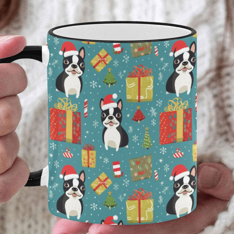 This delightful mug features a charming design that captures the spirit of Boston Terriers, adorned with playful pups in Santa hats surrounded by colorful gifts and candy canes.
