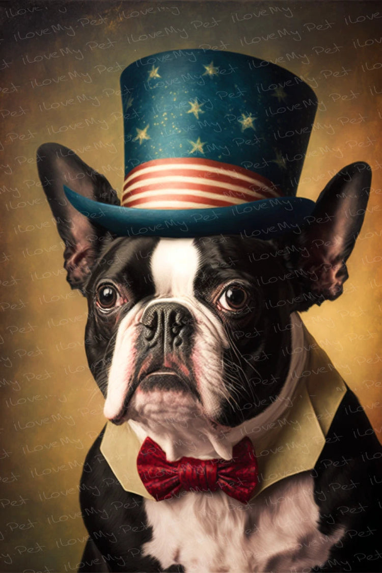 Boston Terrier Decor for decorating your home or office, this poster brings a touch of sophistication and American pride to any space. Whether hung in a living room, study, or hallway, it invites viewers to appreciate the fusion of history and humor.