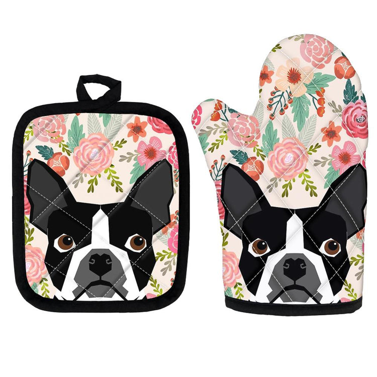 Boston Terrier in Bloom Oven Mitten Glove and Pot Holder Set