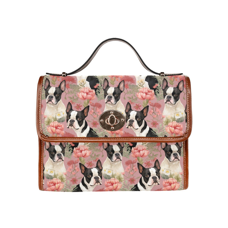 Boston Terriers and Blooms in Pink Satchel Bag Purse