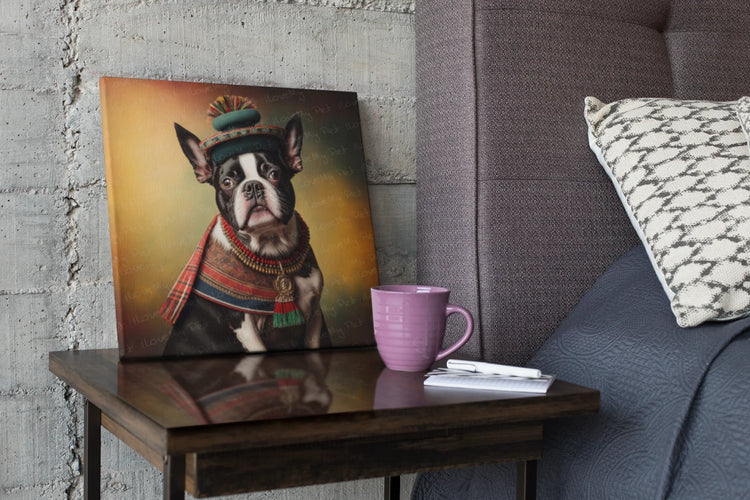 This Boston Terrier Art piece is a celebration of the Boston Terrier's noble character and a whimsical homage to American heritage. An ideal way to add a touch of whimsy and patriotism to your home decor. It serves as an eye-catching centerpiece in any room, inviting viewers to delve into the intricate details and appreciate the fusion of cultural influences.
