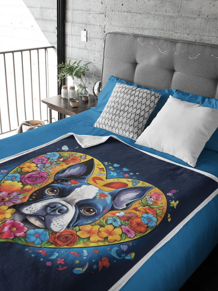 This blanket features an incredible Boston Terrier artwork and design that is unlike anything you've seen before. It showcases a Boston Terrier inside a heart adorned with vibrant flowers, creating a breathtaking and captivating visual representation of love and admiration.