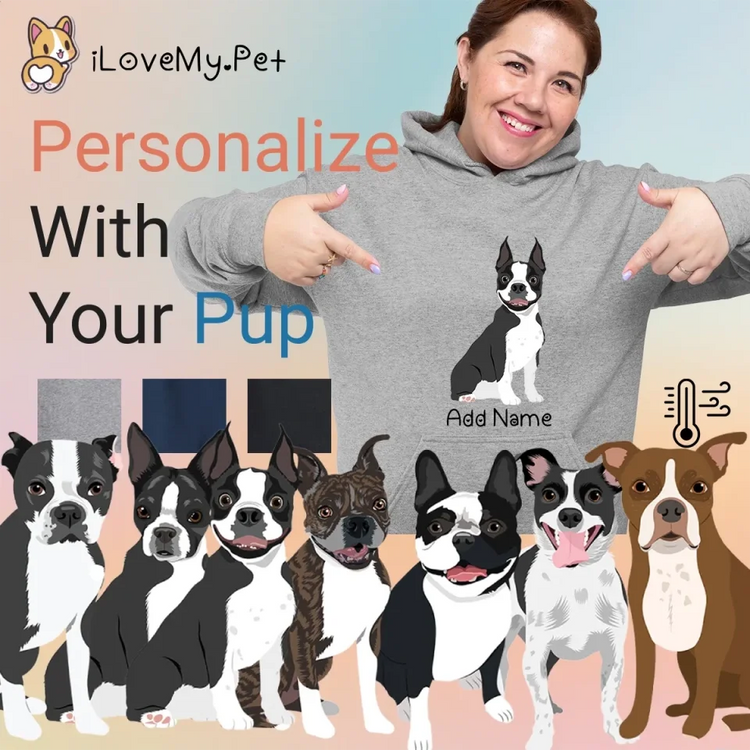 Unleash your furry love with our unique gifts for Boston Terrier lovers. This hoodie is more than just clothing; it's a heartfelt tribute to your beloved pet. Customize it with your pup's likeness and personalize it with their name. True to breed coat color options ensure it captures your Boston Terrier's unique charm.