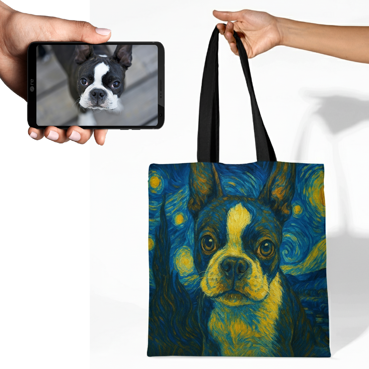 Celebrate your love for your Boston Terrier with our Personalized Starry Night Artwork Canvas Tote Bags! These unique bags are more than just accessories; they are heartfelt expressions of your bond with your furry friend.