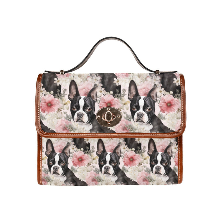Pink and White Floral Boston Terriers Satchel Bag Purse