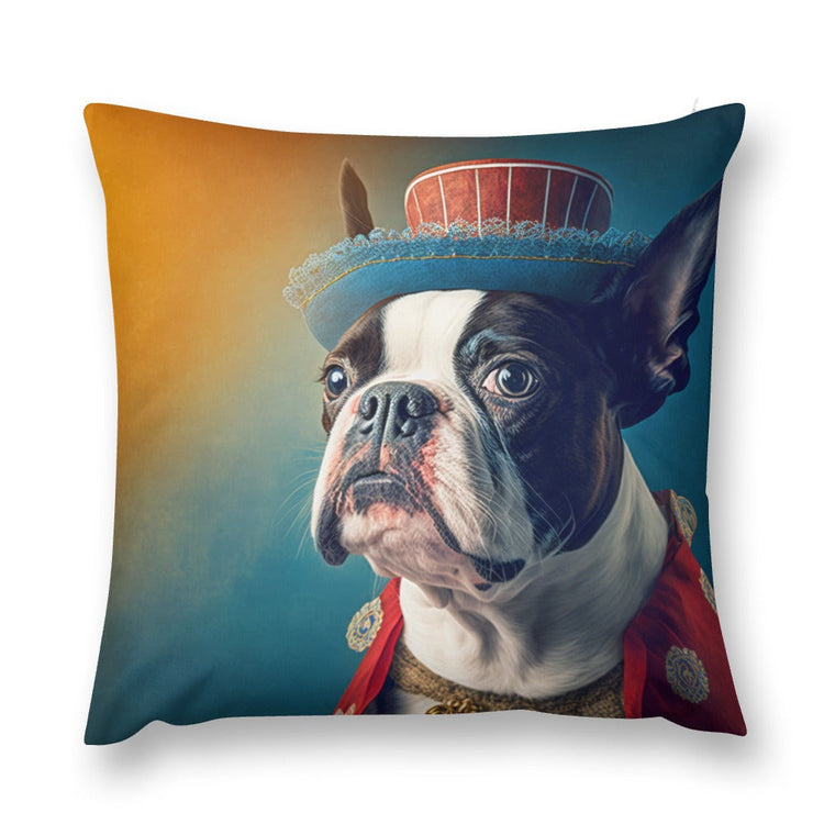 This plush pillow case features a whimsical portrayal of a Boston Terrier, a breed known for its spirited demeanor and deep roots in American history. Dressed in an ensemble that whimsically echoes traditional attire, this artwork captures the essence of historical fashion with a playful twist.