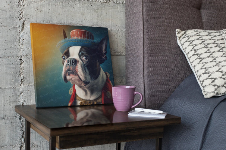 Admire the unique blend of history and canine charm with our Regal Couture Boston Terrier Wall Art Poster.