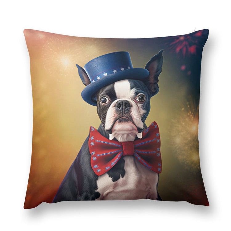 This plush pillow case showcases the whimsical portrayal of the Boston Terrier, a breed with a rich American heritage, dressed in an ensemble that's as charming as it is symbolic.