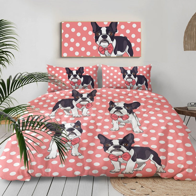 Pink Polka Dotted Bow Tie Boston Terrier Duvet Cover and Pillow Cases Bedding Set