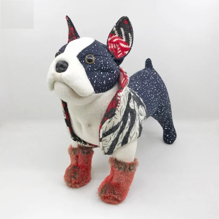 Made of super-soft plush fabric, and stuffed with eco-friendly PP cotton. Featuring a glittering and glamorous Boston Terrier wearing an open collar jacket and furry red boots!
