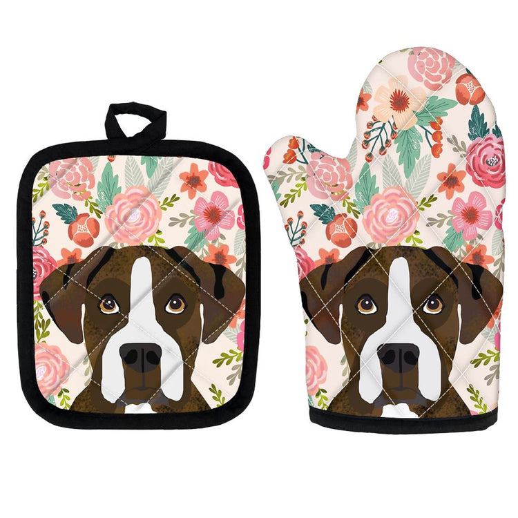 Boxer in Bloom Oven Mitten Glove and Pot Holder Set