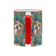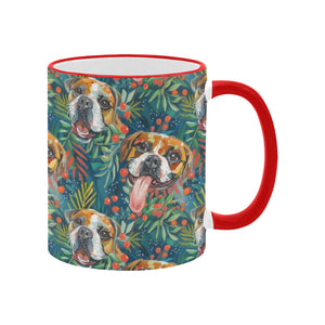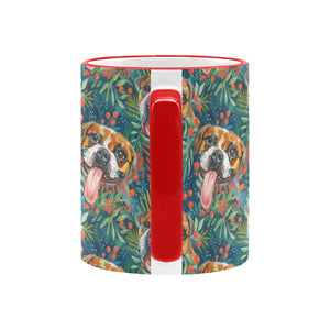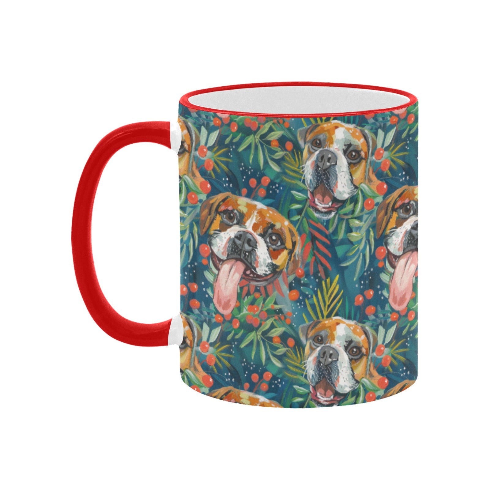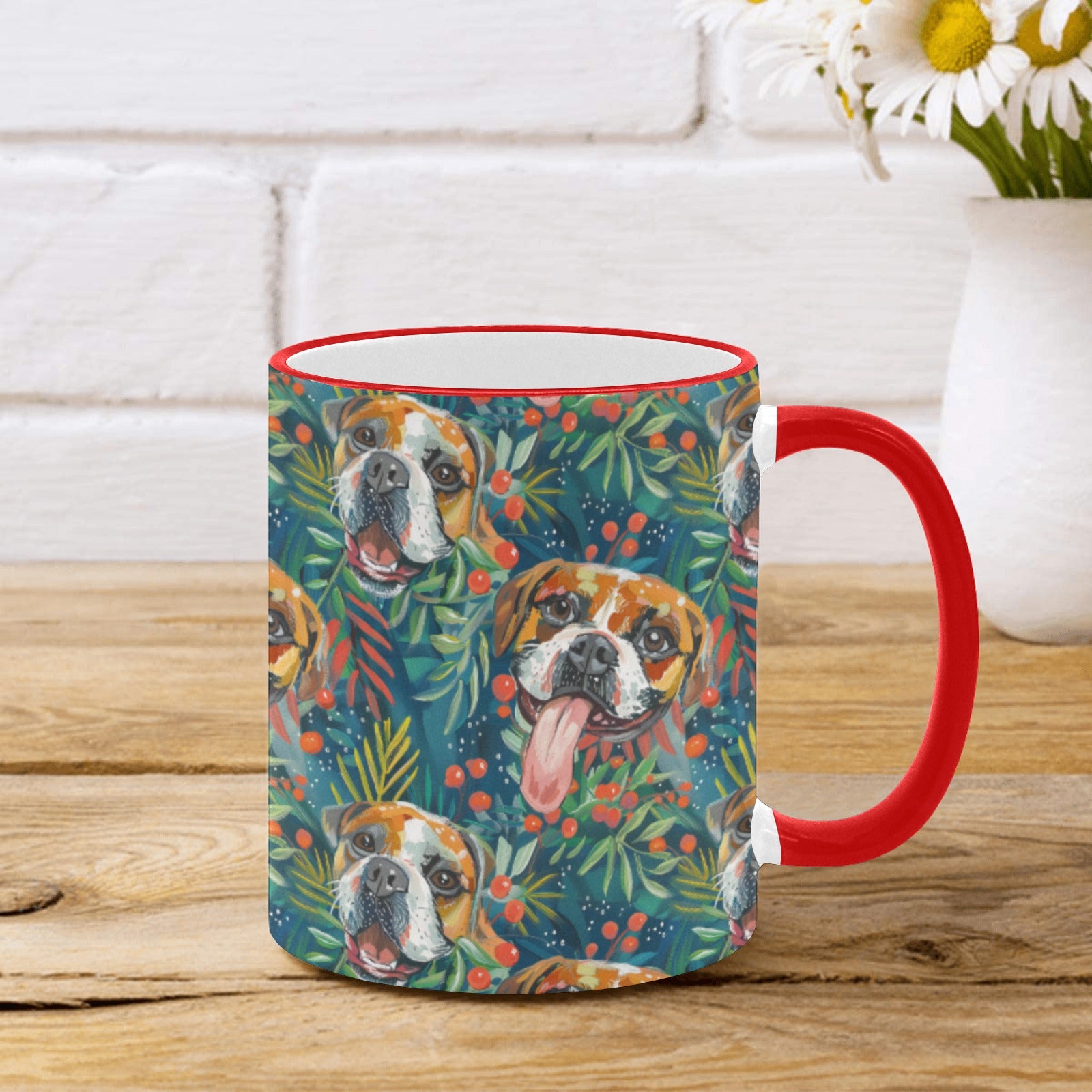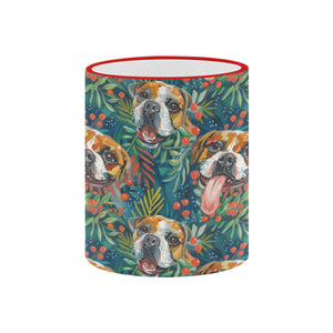 This delightful mug features exuberant artwork that captures the playful spirit of Boxer dogs surrounded by vibrant holly leaves and bright red berries.