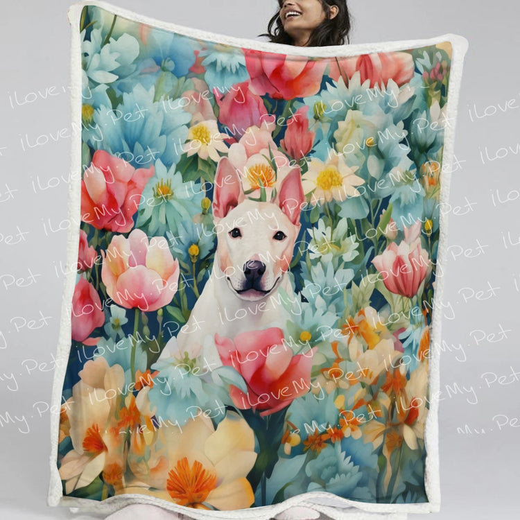 Designed with both Bull Terriers and people in mind, this breathtaking fleece blanket captures the spirited and playful nature of the White Bull Terrier, set against a backdrop of stunning florals. The artwork not only exudes joy but also reflects the Bull Terrier's keen sense of curiosity and vivacity.