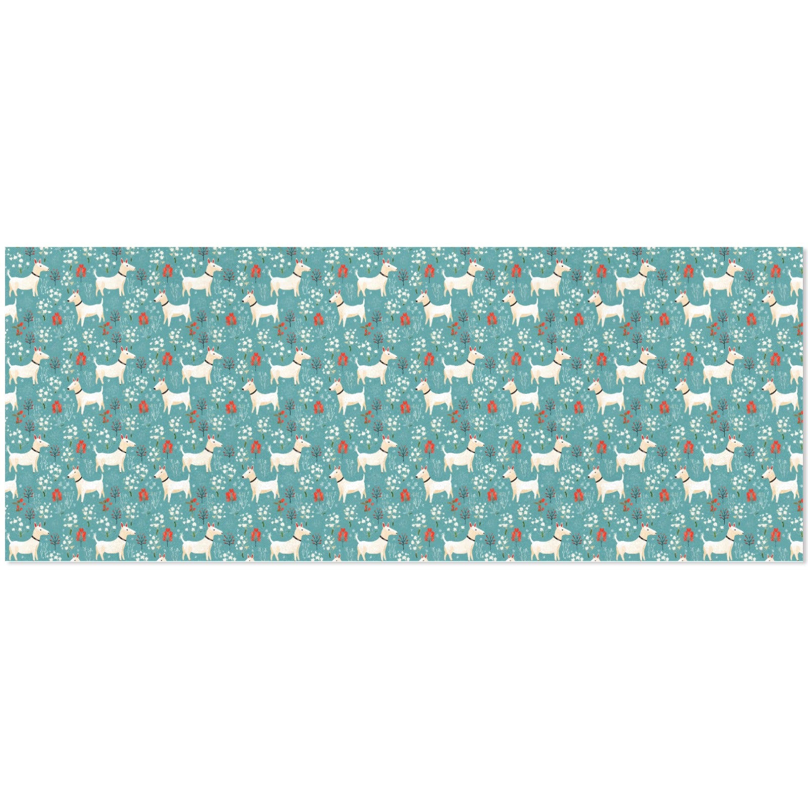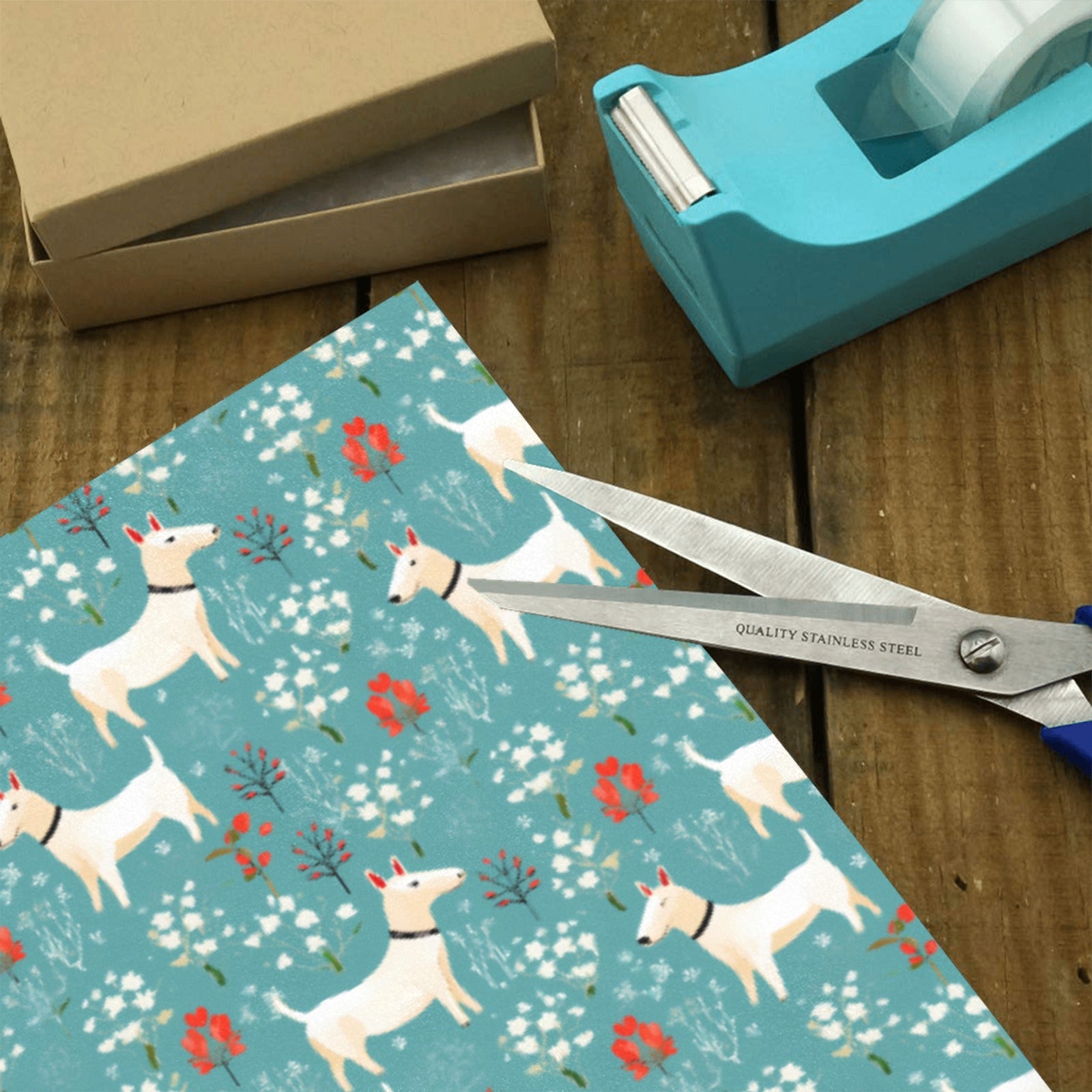 Set against a soft teal backdrop, the crisp white coat of the Bull Terrier pops beautifully. Adorned with sprigs of white and red flowers, this wrapping paper brings a vibrant aesthetic to any occasion.