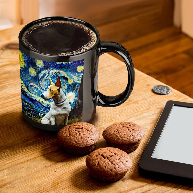 This unique coffee mug features a charming Bull Terrier, set against a backdrop inspired by Vincent Van Gogh's famous Starry Night painting. It's not just a mug; it's a piece of art that celebrates the lively spirit and distinct personality of the Bull Terrier breed.