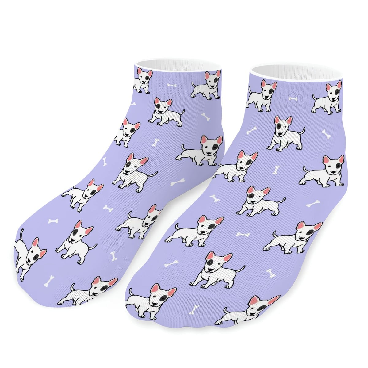 Slip on instant joy with these Eye Patch White Bull Terrier ankle socks from iLoveMy.Pet.