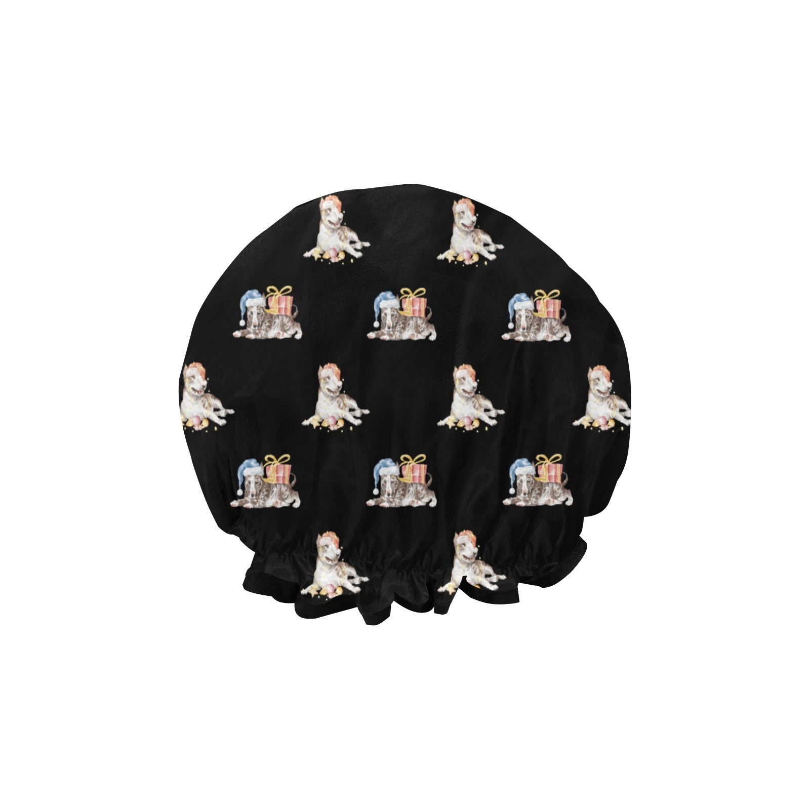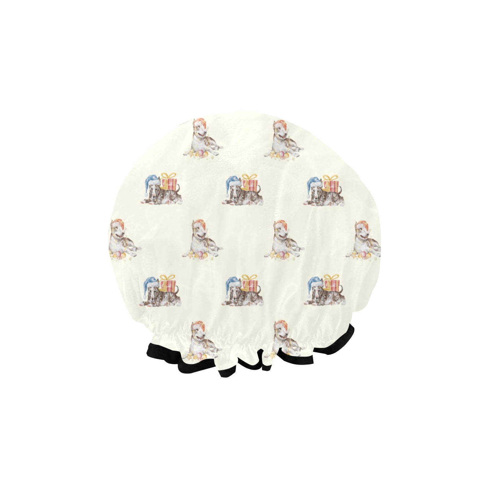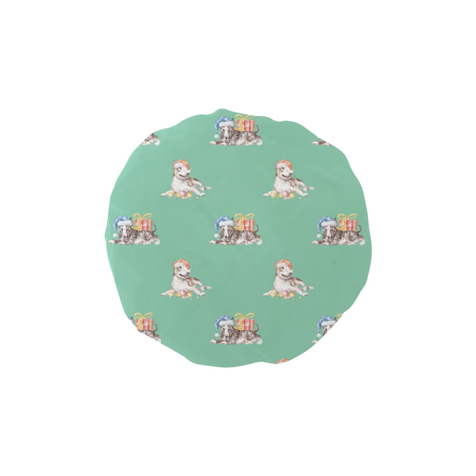 Featuring a stunning watercolor Christmas pattern, these shower caps showcase Brindle Bull Terriers adorned with festive red and blue hats, and delightful accessories.
