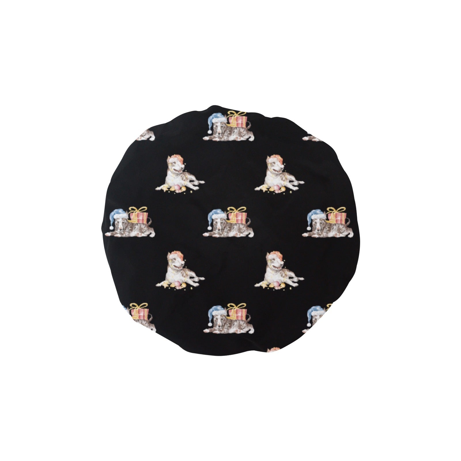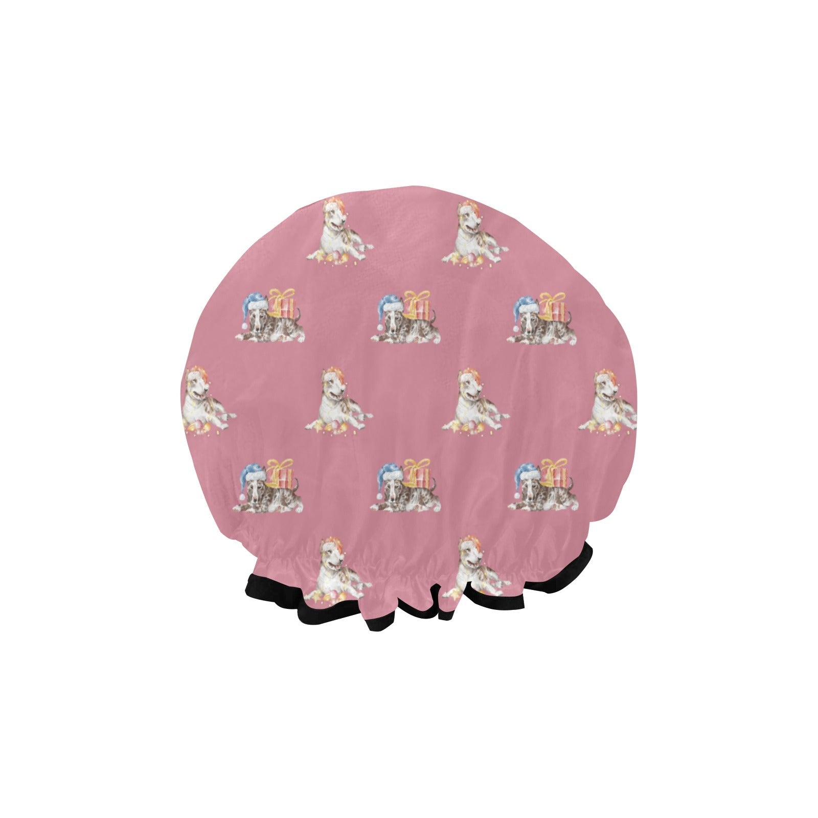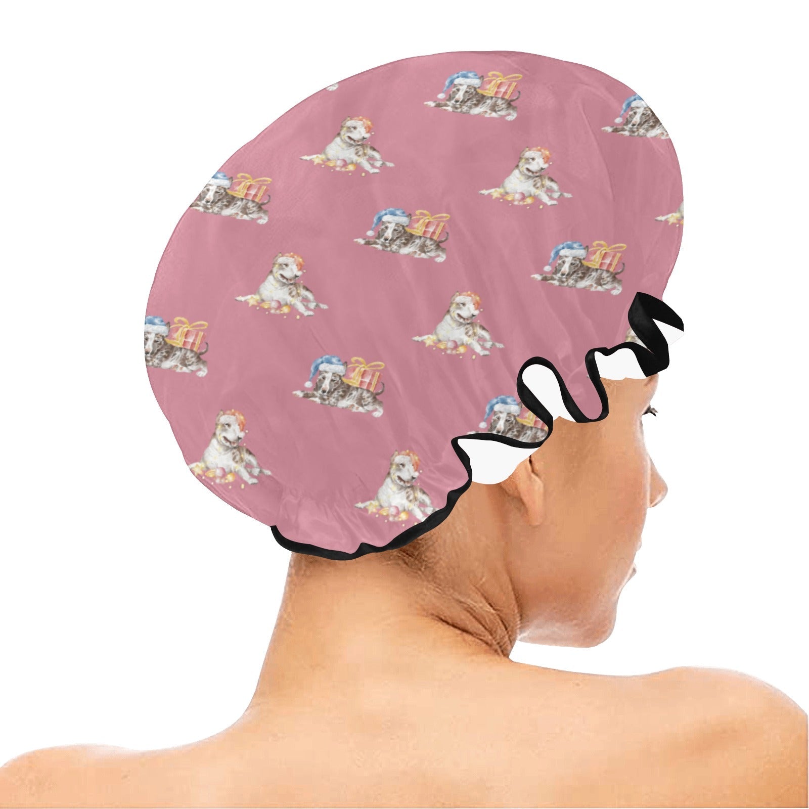 Featuring a stunning watercolor Christmas pattern, these shower caps showcase Brindle Bull Terriers adorned with festive red and blue hats, and delightful accessories.