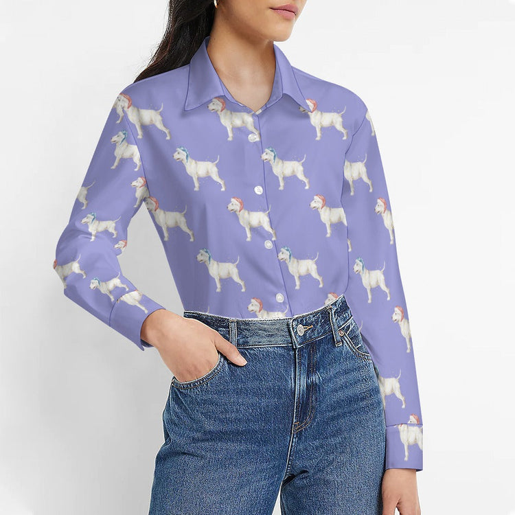 Featuring a beautiful watercolor Christmas pattern of White Bull Terriers, this shirt is adorned with red and blue Christmas hats, and festive accessories like Christmas lights. The artwork beautifully captures the essence of this beloved breed in exquisite detail.