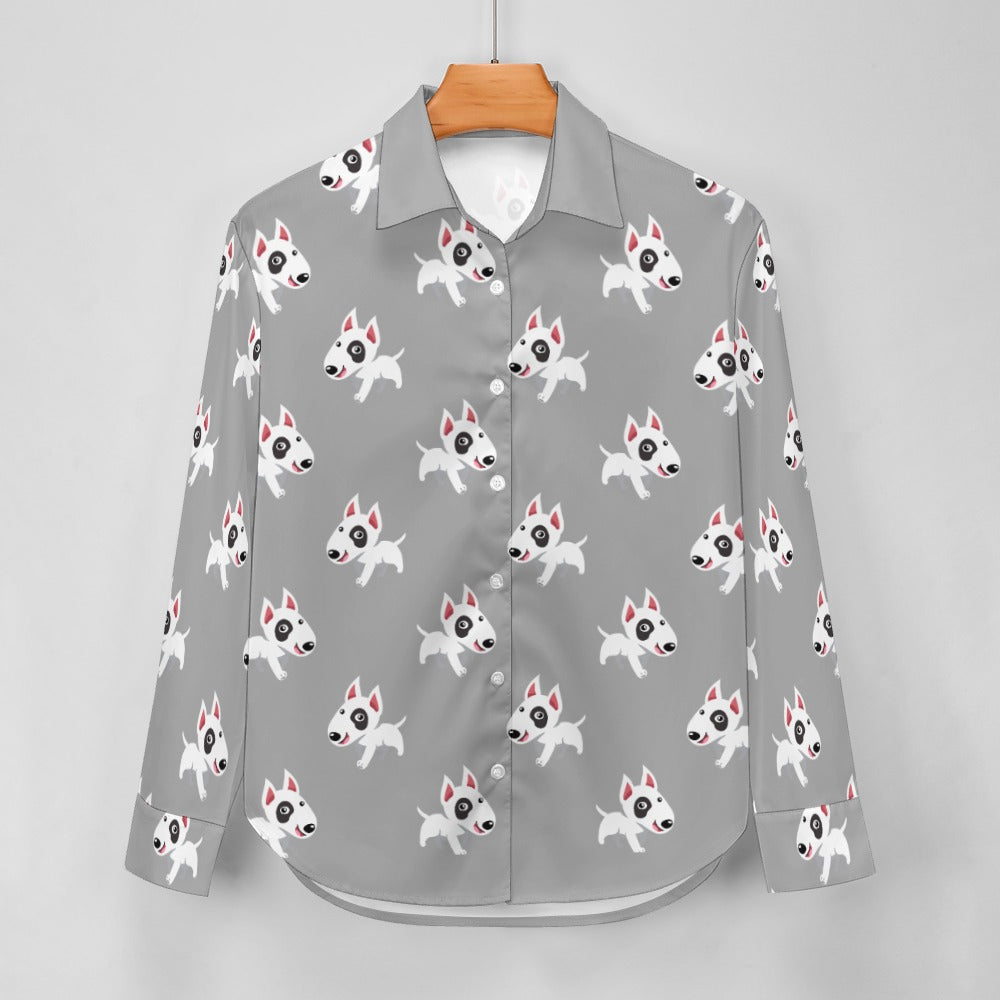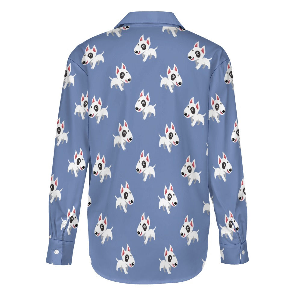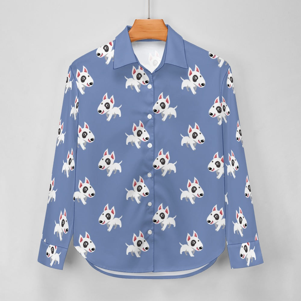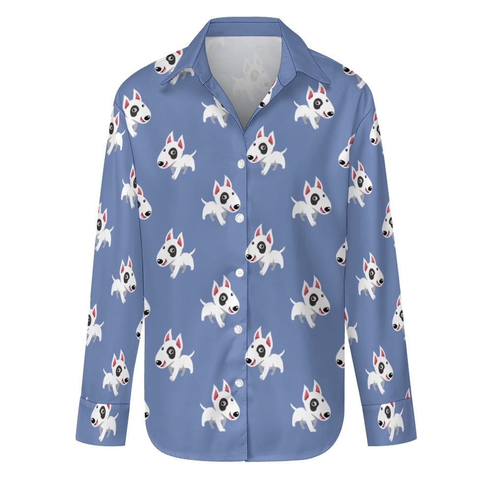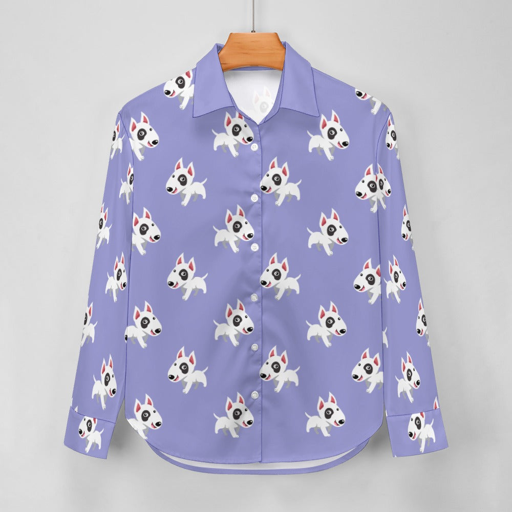 Celebrate your love for Bull Terriers with our Happy Happy Bull Terrier Love Women's Shirt! This delightful shirt features a playful pattern of cartoon Bull Terriers, each exuding joy and energy.