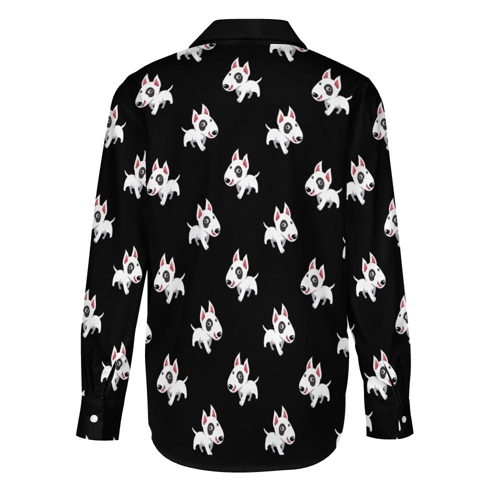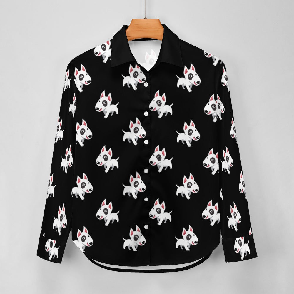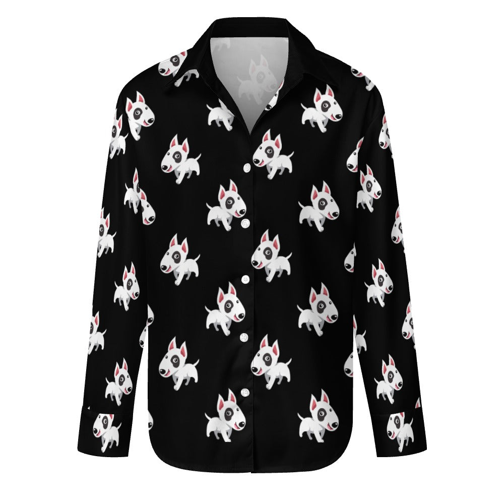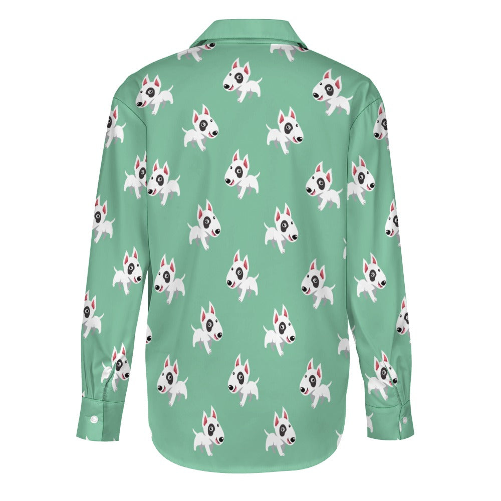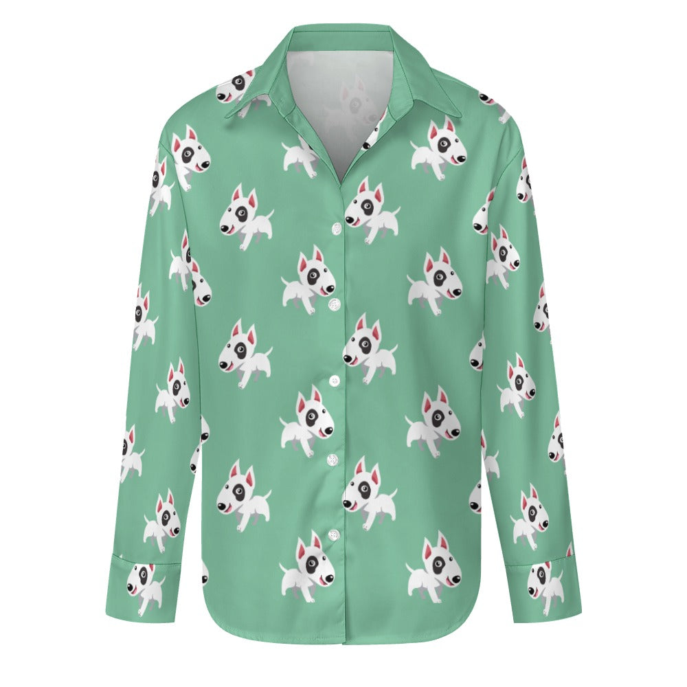 Celebrate your love for Bull Terriers with our Happy Happy Bull Terrier Love Women's Shirt! This delightful shirt features a playful pattern of cartoon Bull Terriers, each exuding joy and energy.