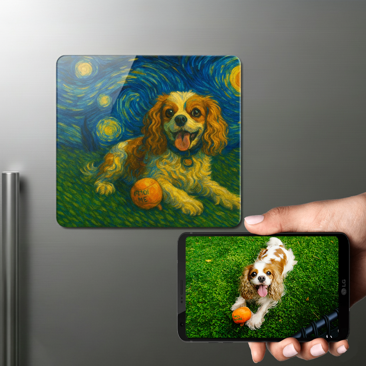 Transform your love for your Cavalier King Charles into a stunning piece of art with our Personalized Starry Night Artwork — Custom Dog Fridge Magnet. This unique magnet captures the essence of your furry friend, bringing joy to your kitchen every day.