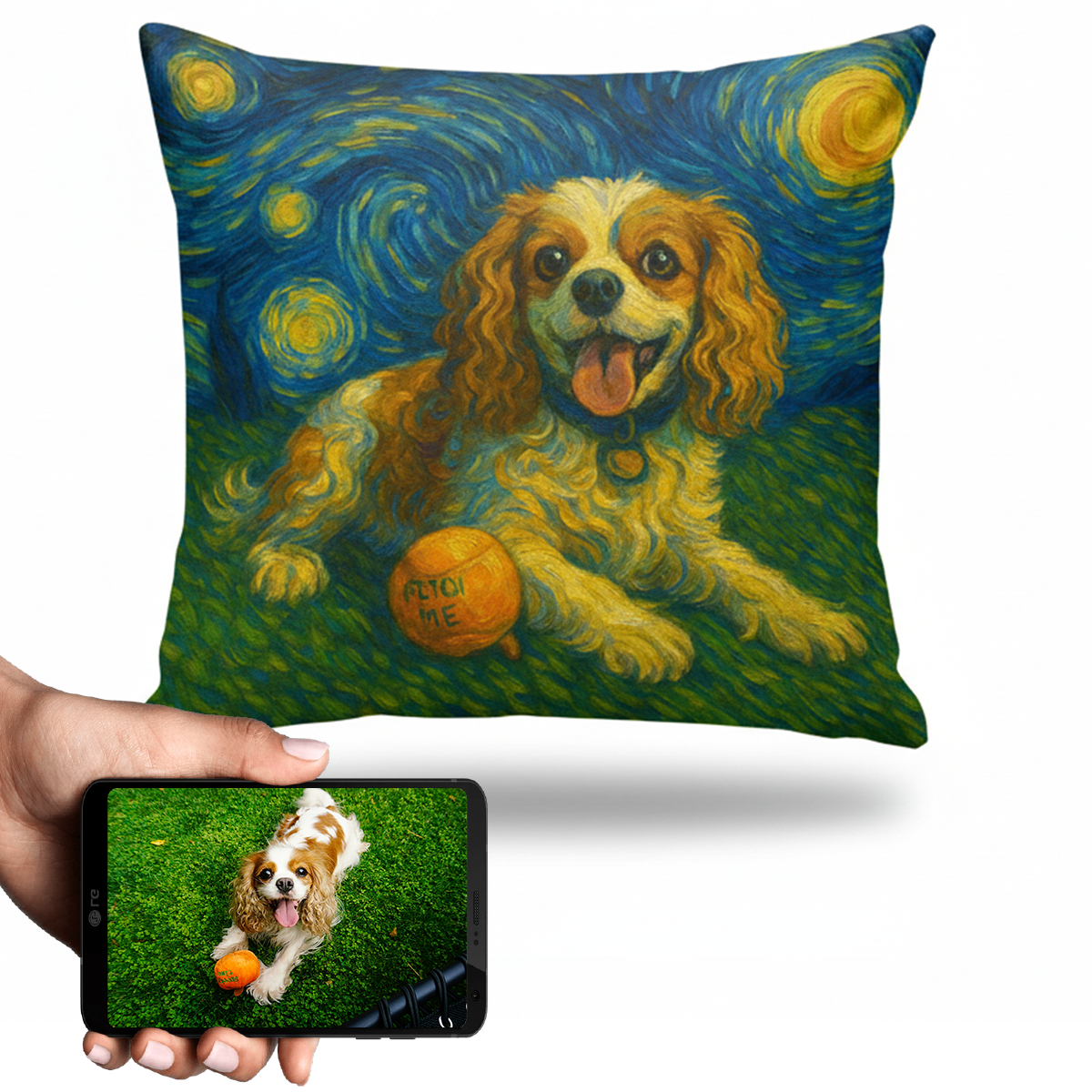 Transform your love for your King Charles Spaniel into a stunning piece of art with our Personalized Starry Night Artwork Custom Pillowcase. This unique creation captures the essence of your furry friend in Van Gogh's iconic style, making it a heartfelt addition to your home.