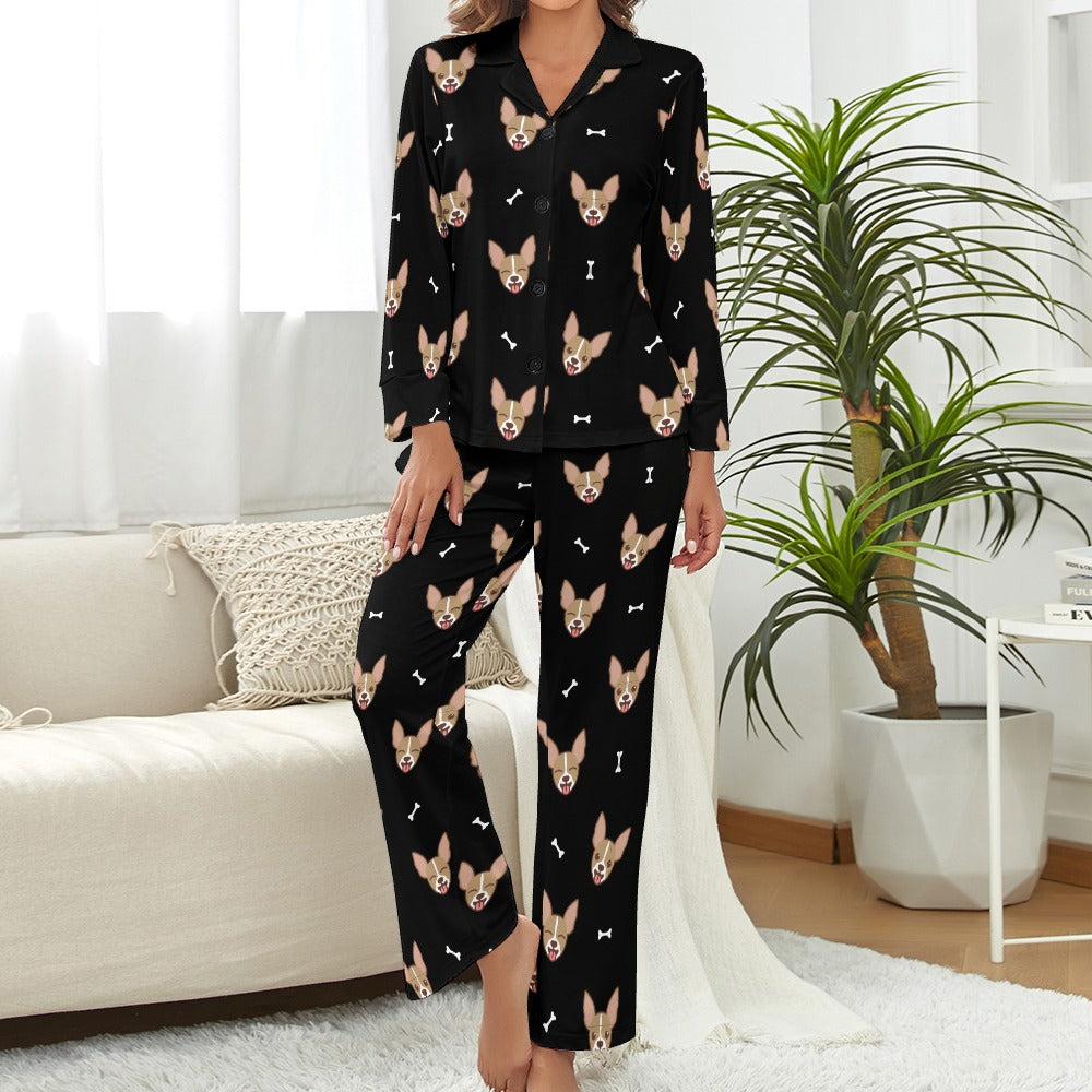 This pajama set features a playful pattern of Chihuahua faces, each with large ears and cheerful expressions.