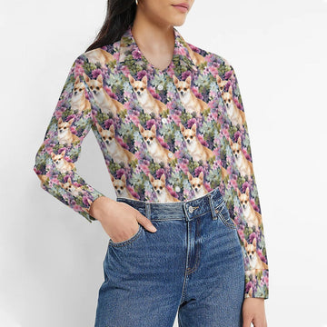 Step into a world of whimsy and joy with our Fawn and White Chihuahua Dreams in Pastel Blooms Women's Shirt.