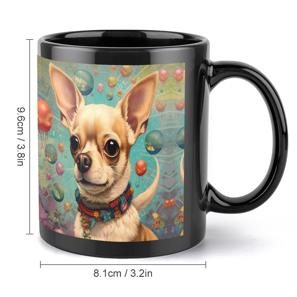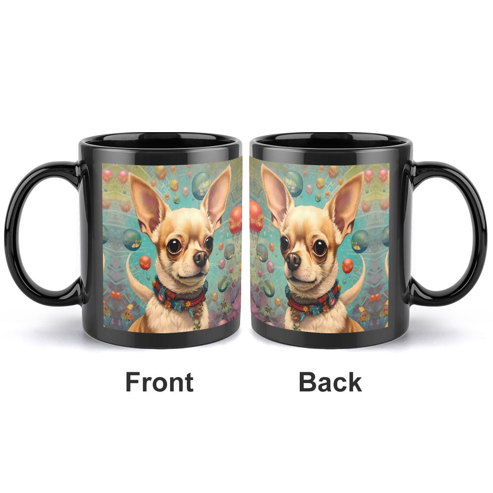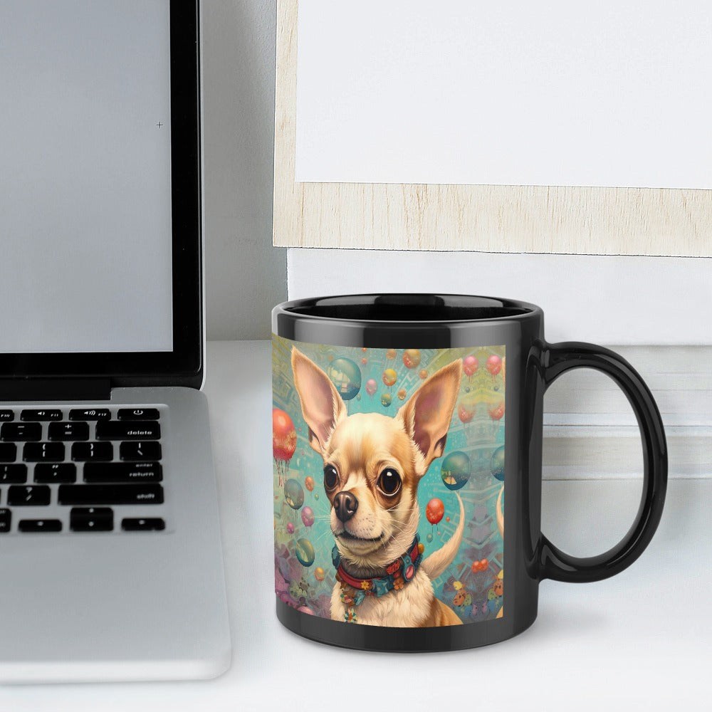 This delightful mug captures the essence of Chihuahuas, showcasing their bold personality against a backdrop of floating balloons and vibrant scenes.