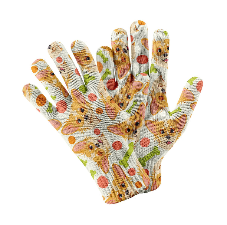 The cutest Long Haired Fawn Chihuahua adorns these gloves, featuring playful toy bone and ball accents that will melt your heart. This charming design spreads joy and happiness wherever you go.
