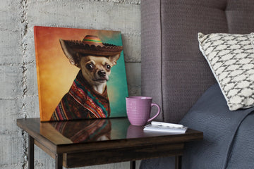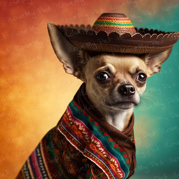 Adorned in vibrant threads of traditional attire, this artwork is a harmonious blend of cultural pride and the innate charm of the Chihuahua breed. The vivid serape draping the dog's frame and the ornate sombrero perched atop speak volumes of Mexican tradition, craftsmanship, and identity.