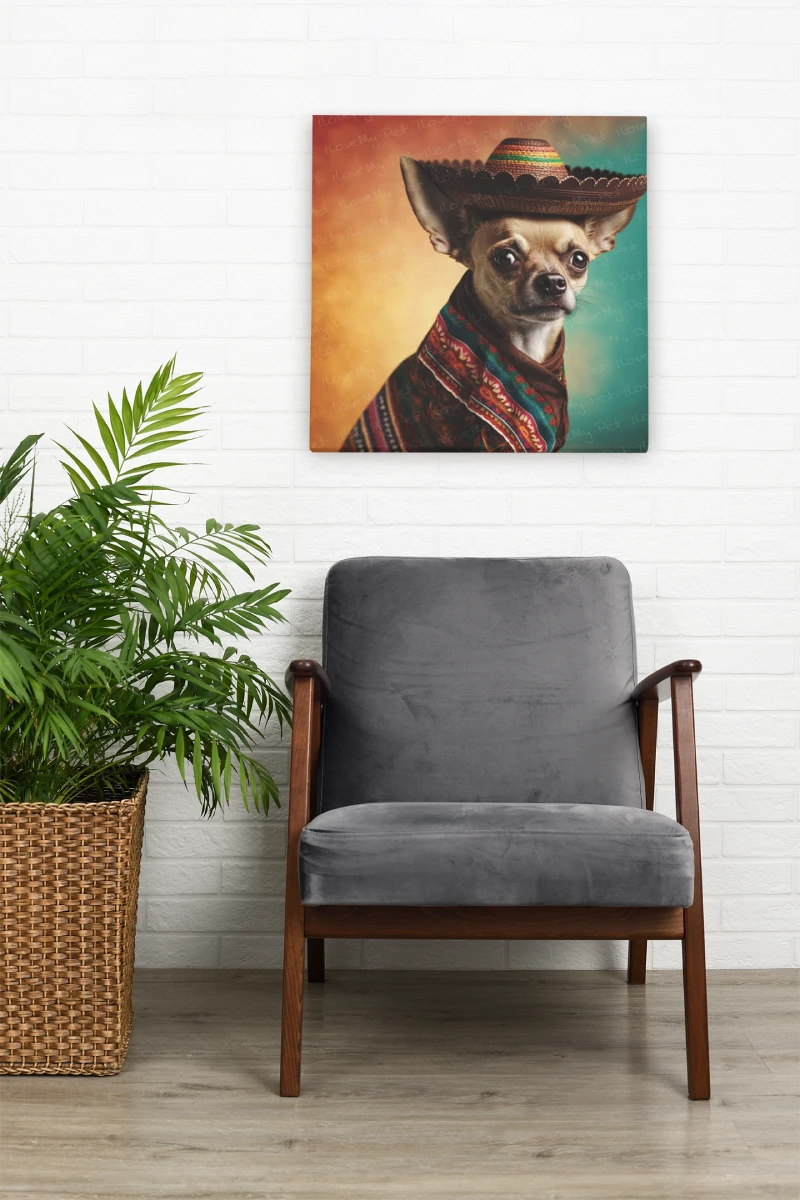 This exquisite piece of art embodies the spirit of a fiesta, encapsulating the essence of Mexican heritage through the depiction of a petite yet proud Chihuahua.