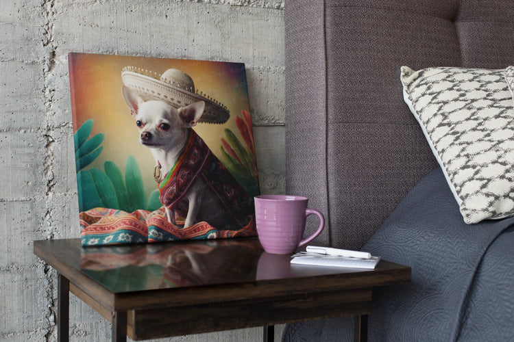 The artwork radiates warmth and the spirit of fiesta, capturing the essence of heritage and canine charisma. It's not just a wall art; it's a story of tradition and elegance, portrayed through the poised and dignified stance of a Chihuahua, a breed deeply rooted in Mexican culture.