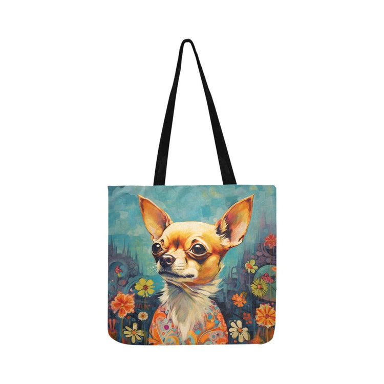 The tote bag features the Chihuahua's expressive eyes and large ears, embodying alertness and intelligence against an imaginative backdrop of a whimsical garden. Abstract flowers bloom in a myriad of shapes and colors, reflecting the vibrant spirit and the indelible impression these tiny companions leave on our hearts.