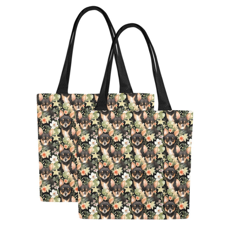 Embrace the enchanting charm of our Moonlight Flower Garden Black and Tan Chihuahuas Large Canvas Tote Bags - a Set of 2, perfect for any Chihuahua lover.