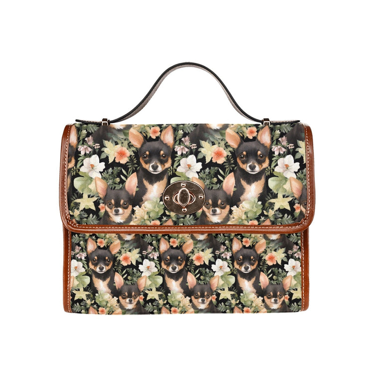 This exquisite shoulder bag showcases a vibrant composition featuring black and tan Chihuahuas amidst a colorful floral array. The design captures the essence of these delightful dogs, with their large rounded eyes, pointed ears, and small snouts artfully depicted. The Chihuahuas, with their expressive faces, take center stage, while the surrounding flowers add a burst of color, creating a harmonious and lively atmosphere.