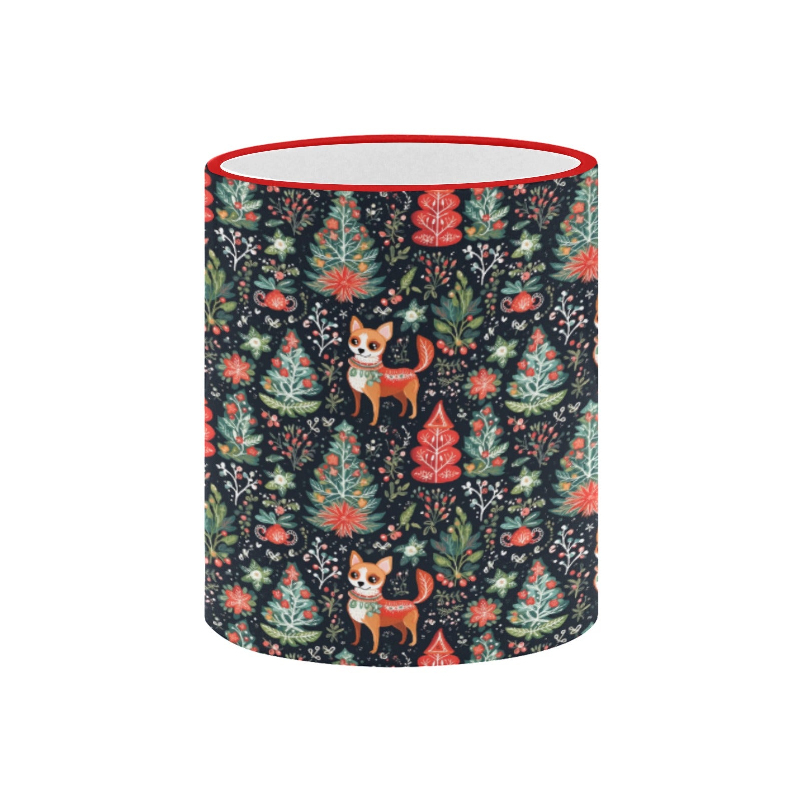 This delightful mug captures the spirit of Chihuahuas, adorned in intricate collars, surrounded by festive flora that brings warmth and cheer to every sip.