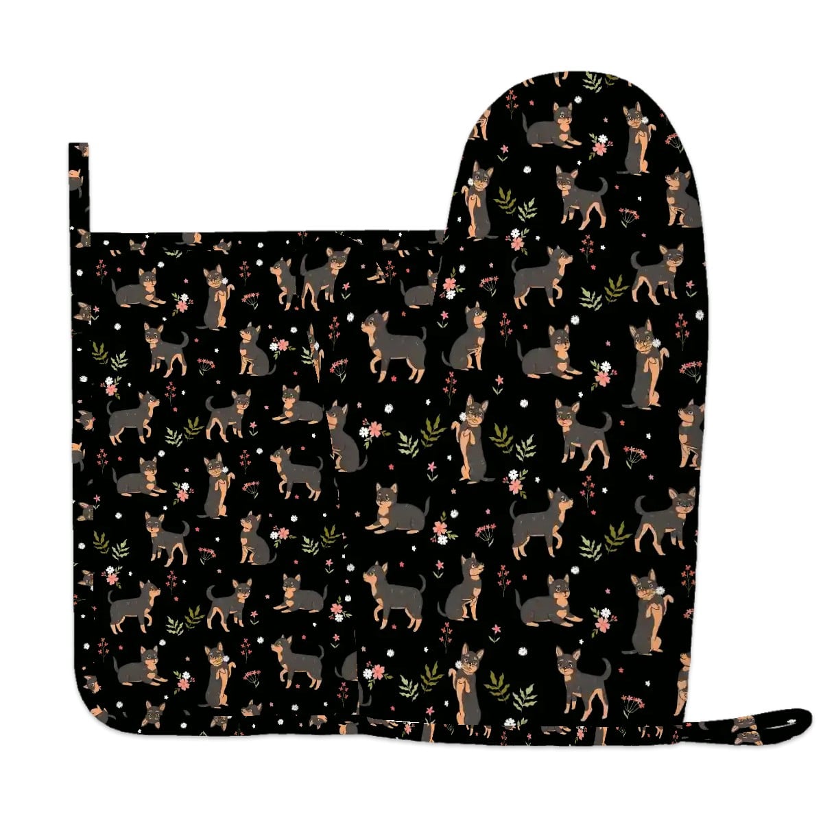 Flower Garden Black Chihuahuas Oven Mitts and Pot Holder Set
