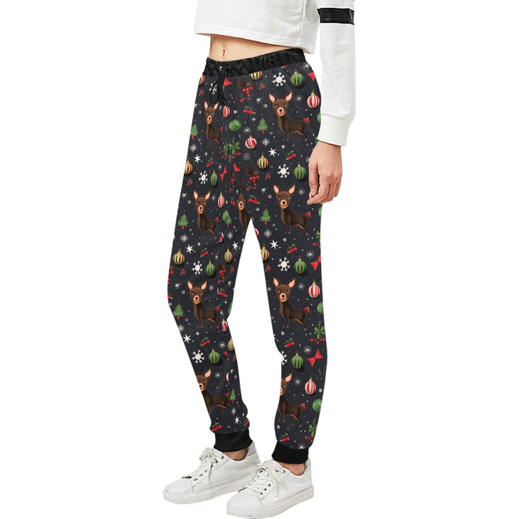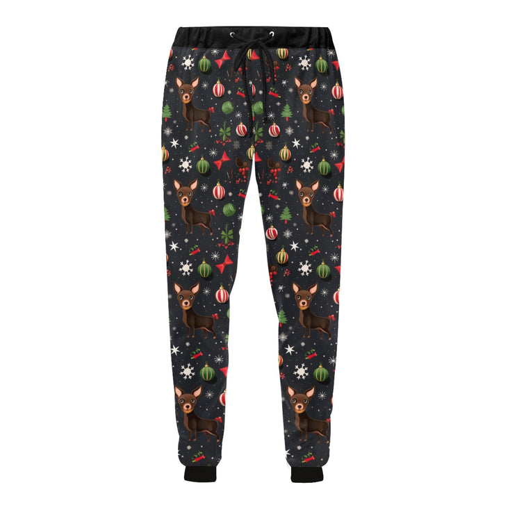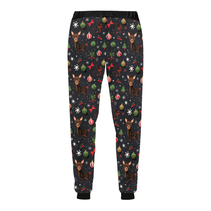 These sweatpants feature an adorable pattern of chocolate Chihuahuas prancing among festive Christmas baubles, holly berries, and snowflakes. Each Chihuahua is lovingly depicted with bright eyes and large ears, wearing a Santa hat, adding a whimsical touch to your holiday wardrobe.
