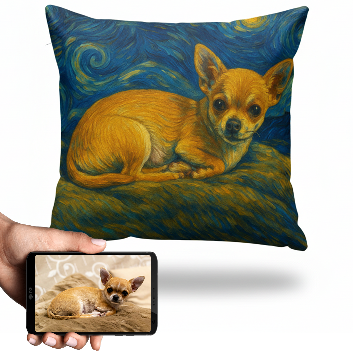 Transform your love for your Chihuahua into a stunning piece of art with our Personalized Starry Night Artwork Custom Chihuahua Pillowcase. This unique creation captures the essence of your furry friend in Van Gogh's iconic style, making it a heartfelt addition to your home.