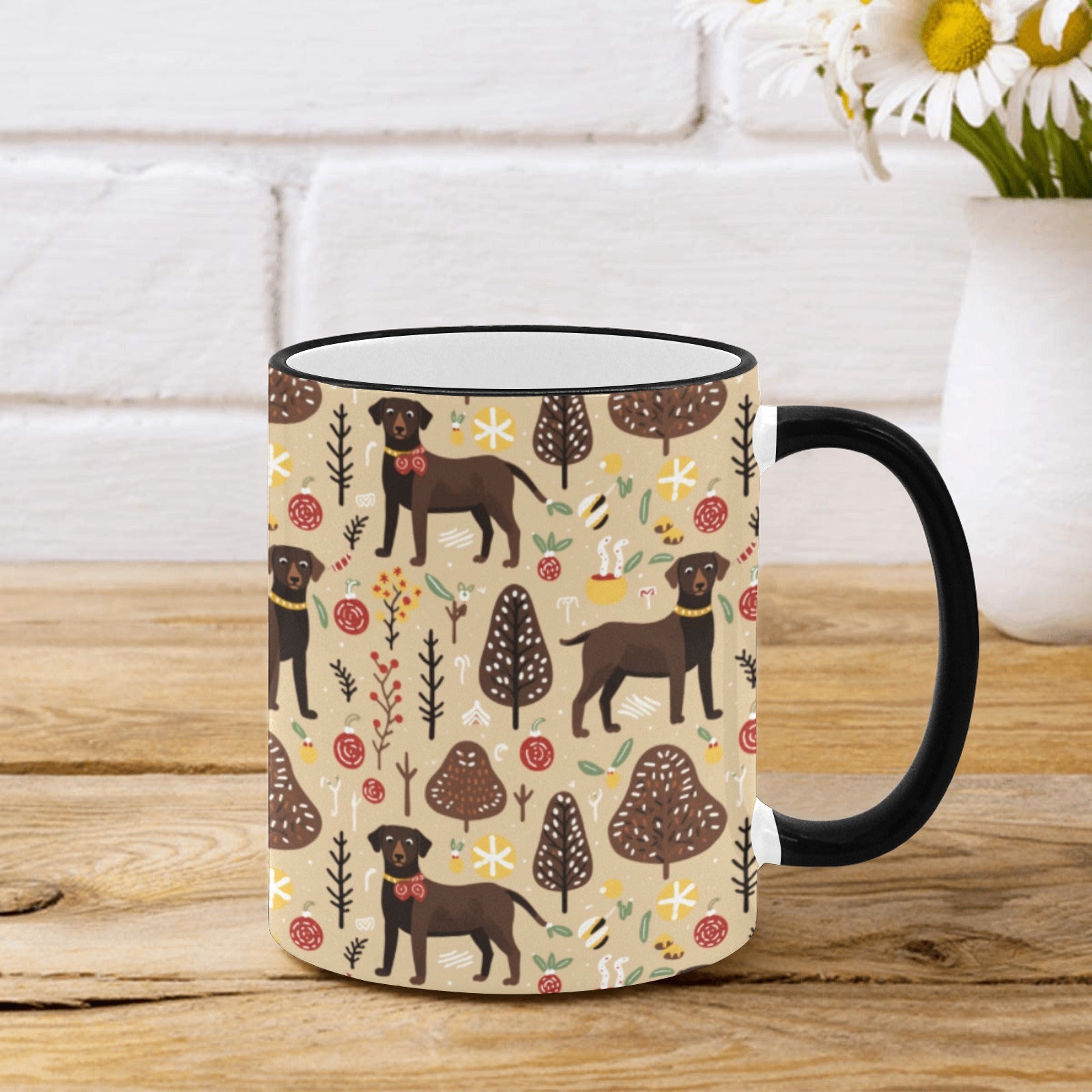 This delightful mug features two charming Labrador Retrievers, set against a festive winter forest backdrop that captures the essence of companionship.