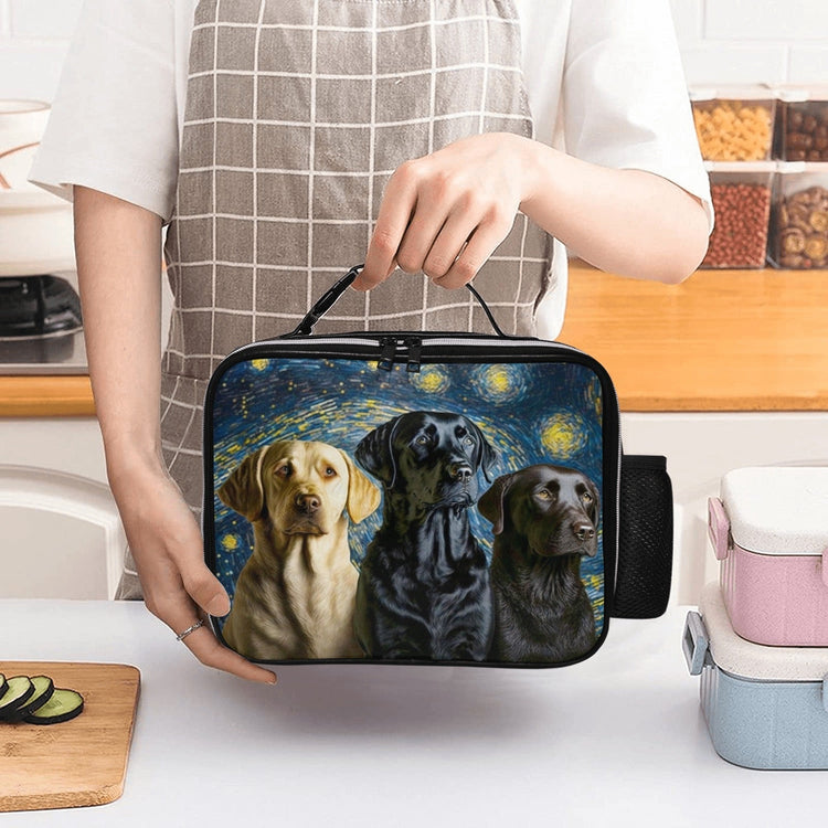 This enchanting lunch bag features a trio of Labradors, each a guardian of the galaxy in their own right, with coats of yellow, black, and chocolate that illuminate against a cosmic backdrop inspired by Van Gogh’s “The Starry Night.”
