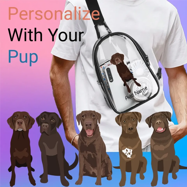 Celebrate your bond with a personalized Chocolate Labrador Unisex Transparent Sling Bag. This thoughtful gift captures your pup's likeness and name, making it a cherished accessory.