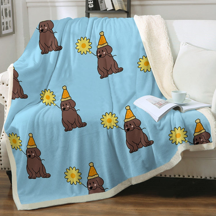 Picture the most endearing Chocolate Labradors, donning charming orange hats and presenting a bright yellow sunflower to their beloved human. This design isn't just a blanket; it's an embodiment of the playful and loyal nature of the Chocolate Labrador.
